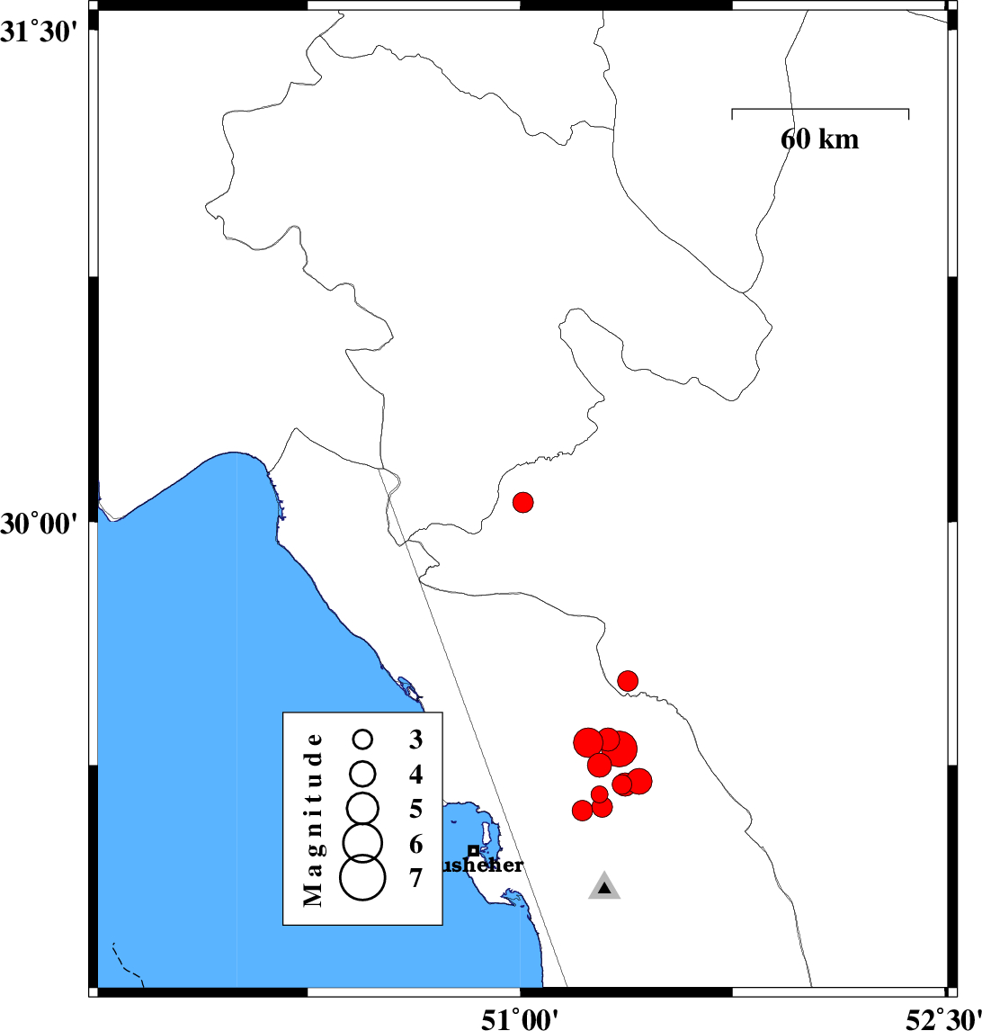 | 2013/11/29 | 06:05:06.6 | 09:35:06.6 | 29.2 | 51.42 | 15 | ML4.1 | Bushehr Province, 22 km East of Borazjan | ||