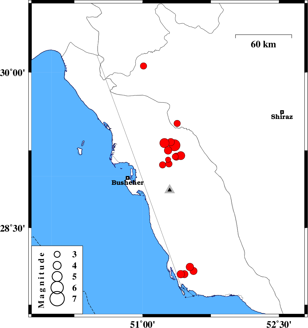 | 2013/11/29 | 07:43:15.0 | 11:13:15.0 | 28.05 | 51.46 | 30 | ML3.6 | Bushehr Province, 68 km South of Khormog | ||