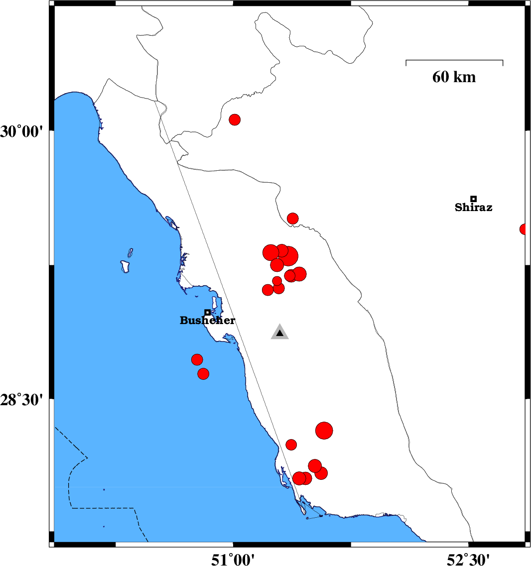 | 2013/11/29 | 18:46:04.3 | 22:16:04.3 | 29.12 | 51.29 | 15 | ML3.2 | Bushehr Province, 18 km South of Borazjan | ||