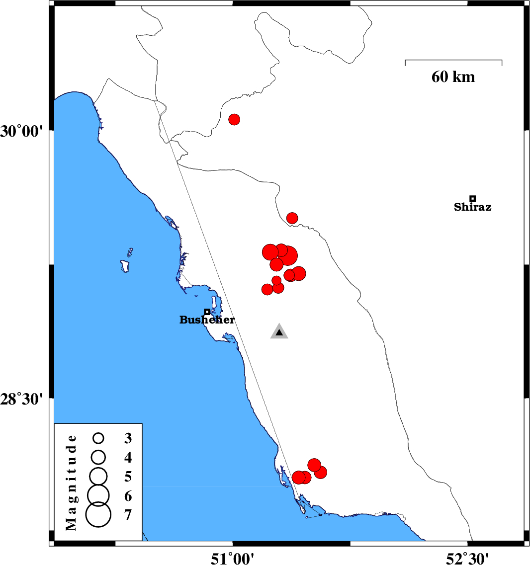| 2013/11/29 | 07:43:15.0 | 11:13:15.0 | 28.05 | 51.46 | 30 | ML3.6 | Bushehr Province, 68 km South of Khormog | ||