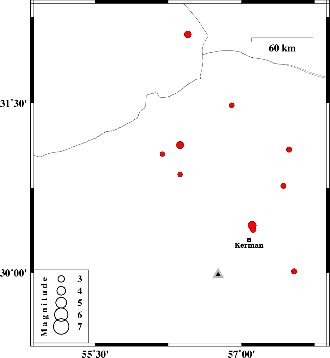 | 2013/11/12 | 02:27:23.4 | 05:57:23.4 | 30.42 | 57.11 | 14 | ML3.8 | Kerman Province, 15 km North of Kerman |
