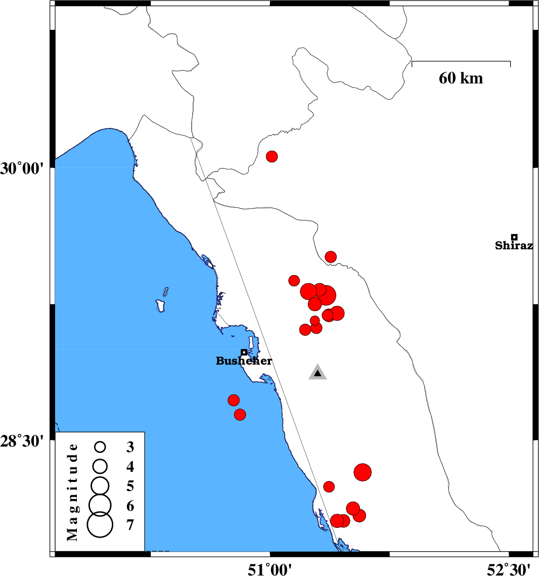 | 2013/11/08 | 21:14:14.0 | 00:44:14.0 | 28.64 | 50.81 | 15 | ML3.2 | Persian Gulf, 39 km South of Busheher |