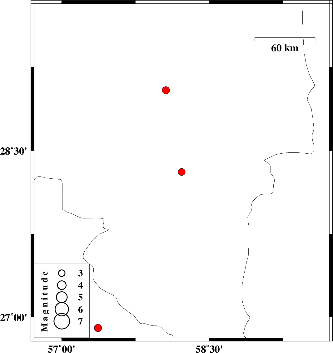 | 2013/12/05 | 11:28:50.1 | 14:58:50.1 | 29.04 | 58.06 | 15 | ML3.4 | Kerman Province, 30 km West of Bam | ||