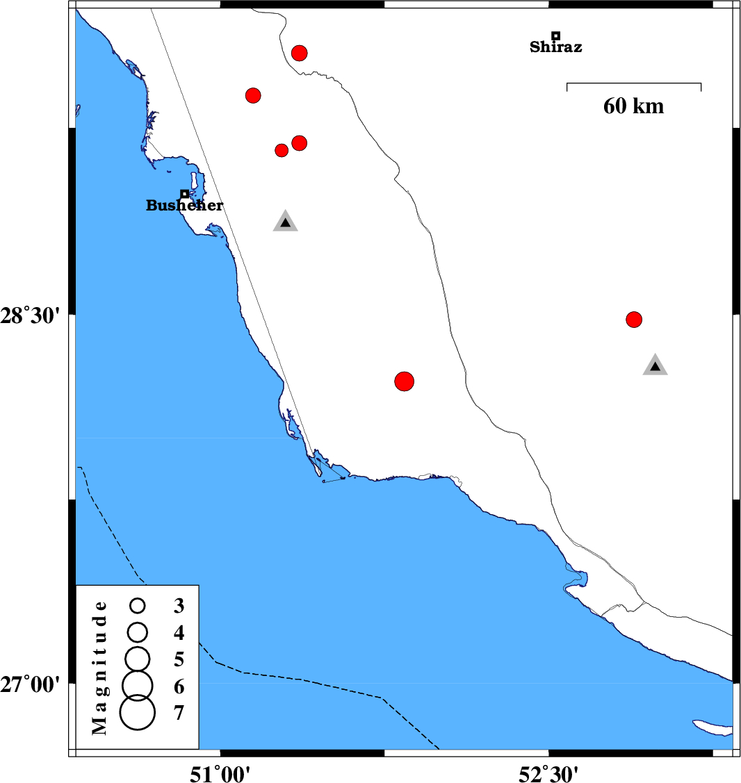| 2013/12/03 | 11:24:09.9 | 14:54:09.9 | 29.16 | 51.28 | 23 | ML2.7 | Bushehr Province, 14 km South of Borazjan |