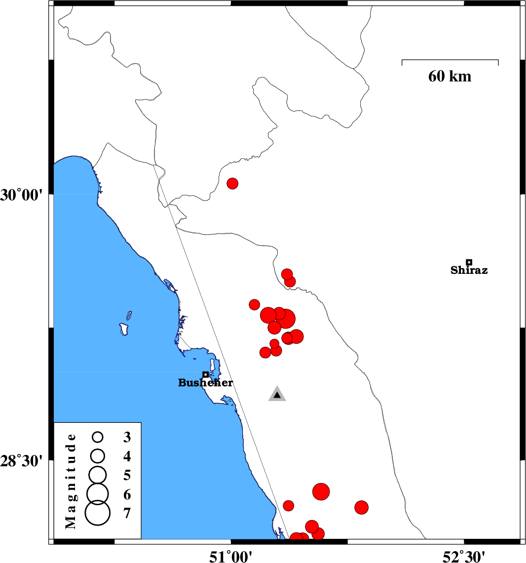 | 2013/11/29 | 07:43:15.0 | 11:13:15.0 | 28.05 | 51.46 | 30 | ML3.6 | Bushehr Province, 68 km South of Khormog | ||