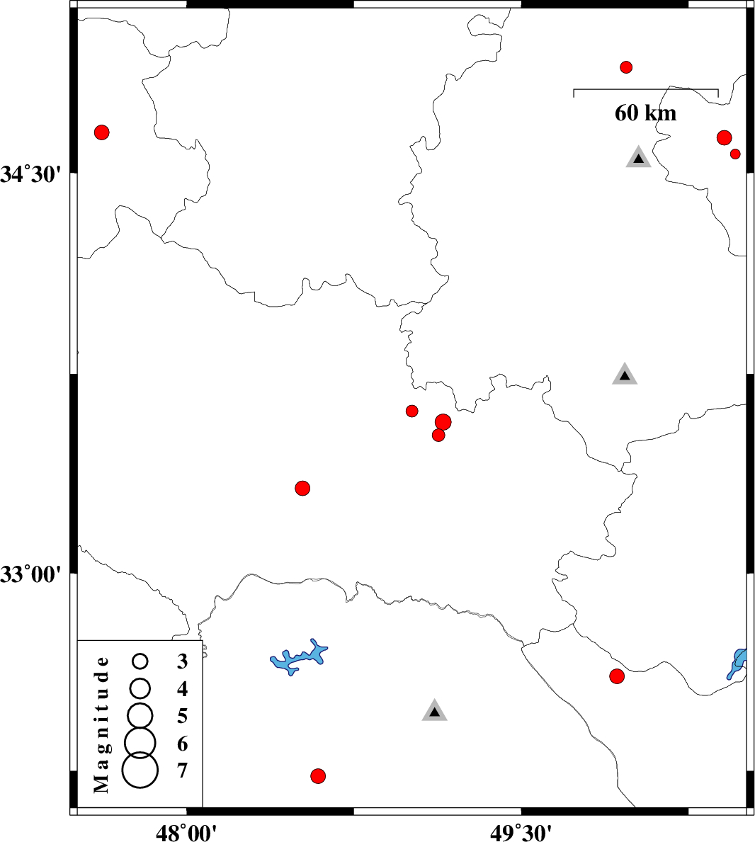 | 2013/11/12 | 09:50:14.7 | 13:20:14.7 | 33.52 | 49.13 | 6 | ML2.5 | Lorestan Province, 6 km Dorud | ||