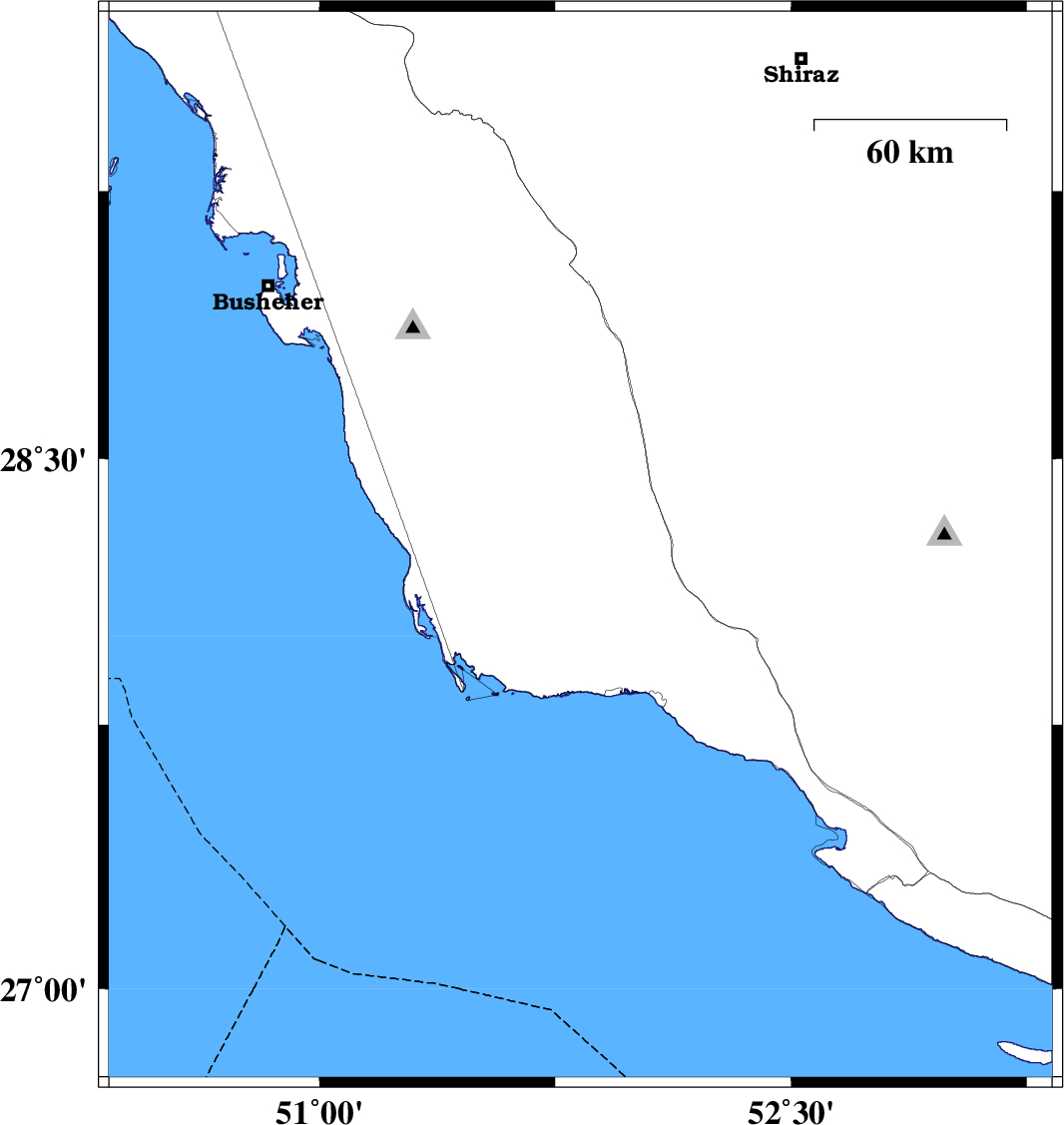 | 2013/11/29 | 18:46:04.3 | 22:16:04.3 | 29.12 | 51.29 | 15 | ML3.2 | Bushehr Province, 18 km South of Borazjan | ||