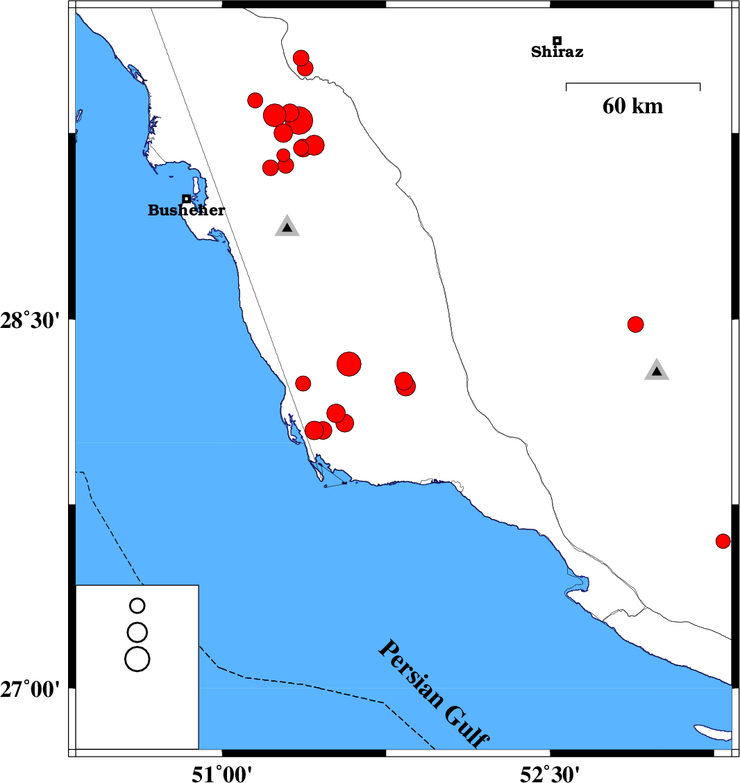 | 2013/11/29 | 07:43:15.0 | 11:13:15.0 | 28.05 | 51.46 | 30 | ML3.6 | Bushehr Province, 68 km South of Khormog | ||