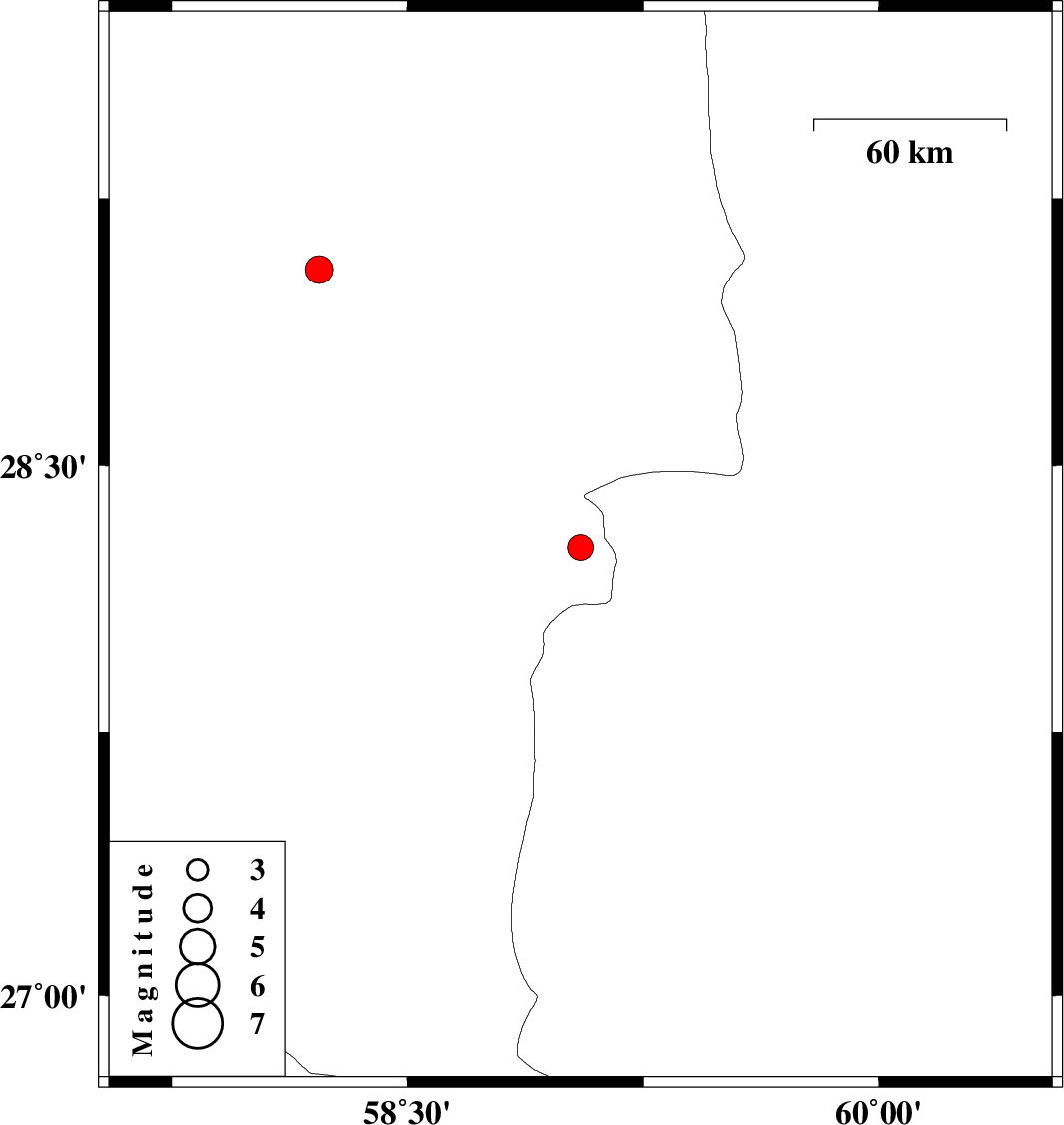 | 2013/12/17 | 05:19:32.9 | 08:49:32.9 | 28.27 | 59.05 | 18 | ML3.7 | Kerman Province, 115 km South-East of Bam |