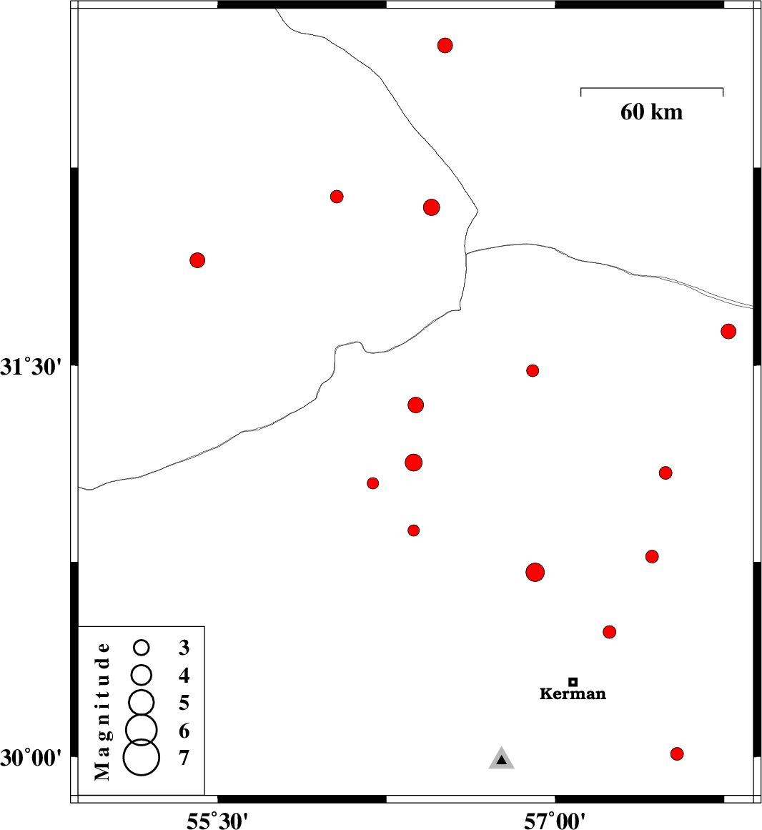 | 2013/11/17 | 18:47:46.0 | 22:17:46.0 | 30.77 | 57.43 | 14 | ML2.6 | Kerman Province, 63 km North-East of Kerman |
