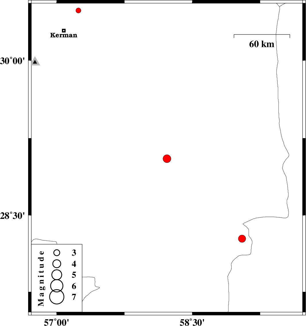 | 2013/12/17 | 20:07:40.9 | 23:37:40.9 | 29.05 | 58.22 | 15 | ML3.9 | Kerman Province, 15 km West of Bam | ||