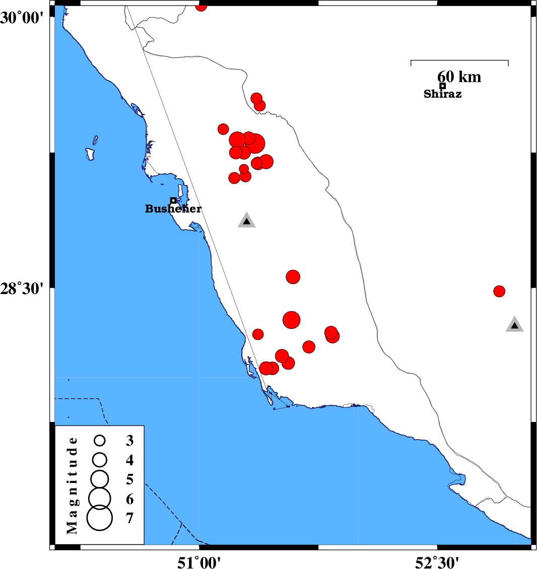 | 2013/11/29 | 07:43:15.0 | 11:13:15.0 | 28.05 | 51.46 | 30 | ML3.6 | Bushehr Province, 68 km South of Khormog | ||
