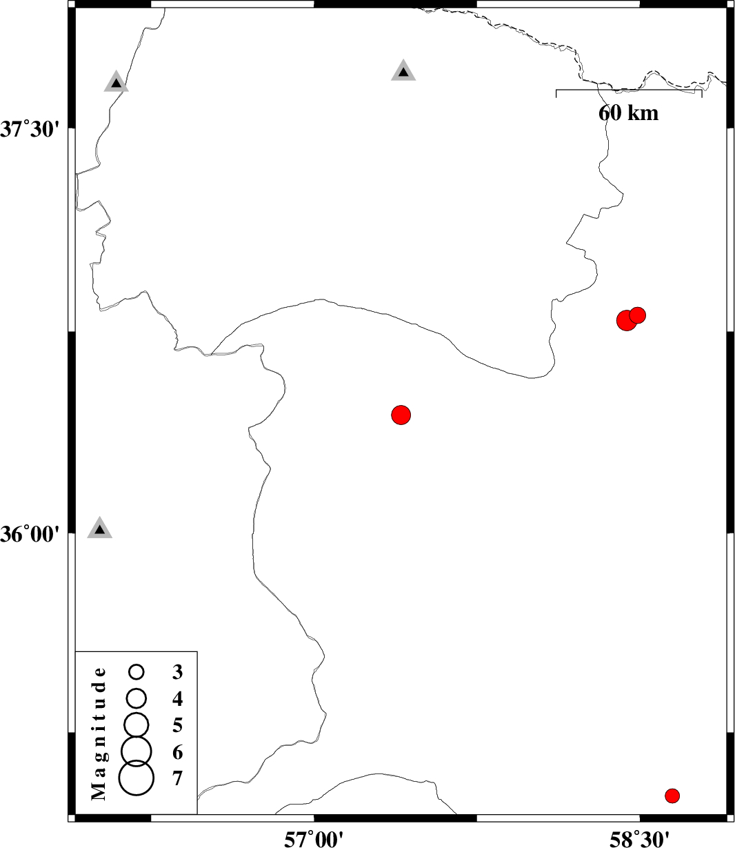 | 2013/12/09 | 10:12:00.3 | 13:42:00.3 | 36.81 | 58.49 | 14 | ML3.4 | Khorasan(center) Province, 33 km South of Quchan | ||