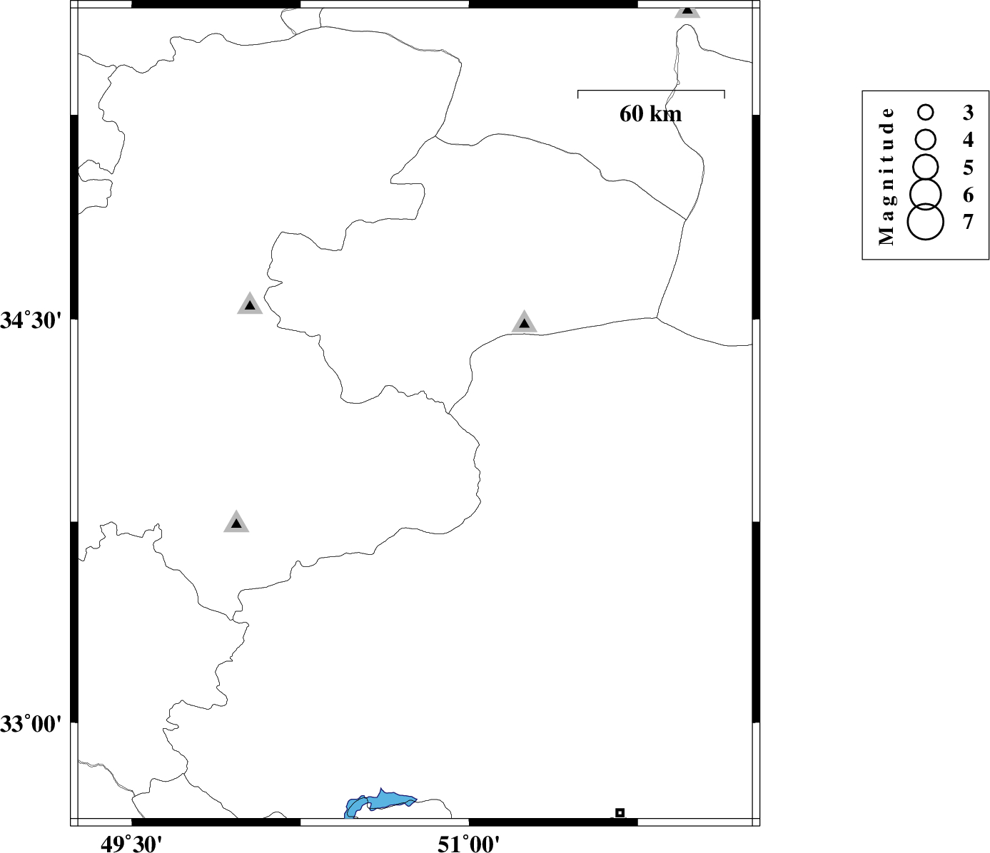 | 2013/12/27 | 04:01:39.2 | 07:31:39.2 | 33.57 | 49.29 | 15 | ML2.1 | Lorestan Province, 21 km North-West of Azna | ||