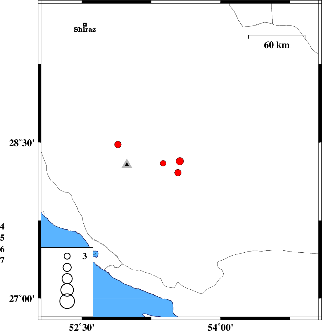 | 2013/12/29 | 13:27:21.3 | 16:57:21.3 | 28.32 | 53.56 | 17 | ML3.6 | Fars Province, 20 km South of Jahrom | ||