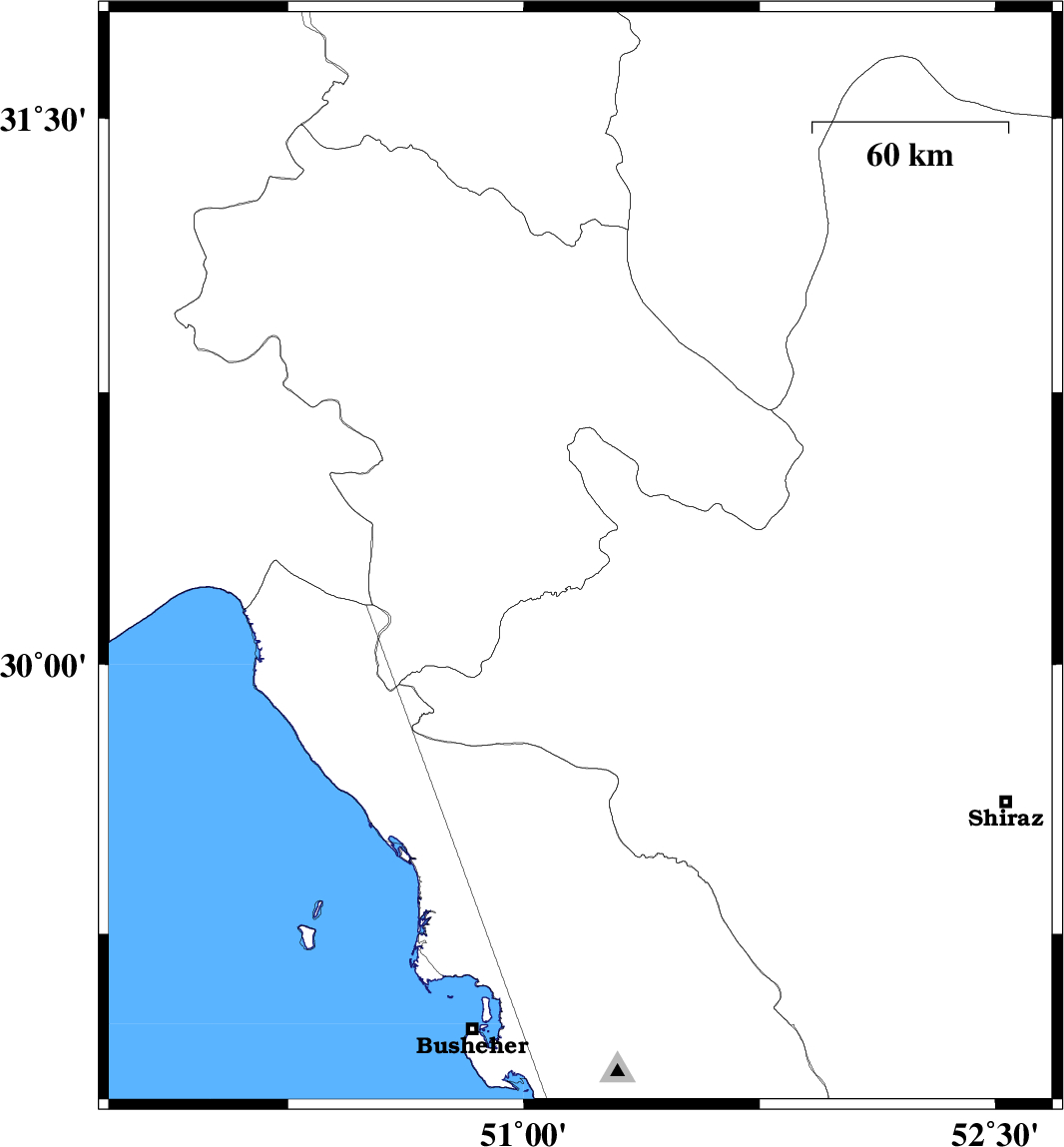 | 2013/11/29 | 18:46:04.3 | 22:16:04.3 | 29.12 | 51.29 | 15 | ML3.2 | Bushehr Province, 18 km South of Borazjan | ||