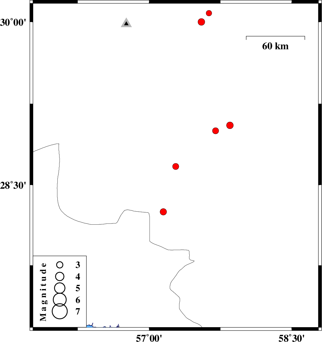 | 2013/12/23 | 06:11:07.9 | 09:41:07.9 | 30 | 57.55 | 14 | ML3.2 | Kerman Province, 56 km South-East of Kerman |