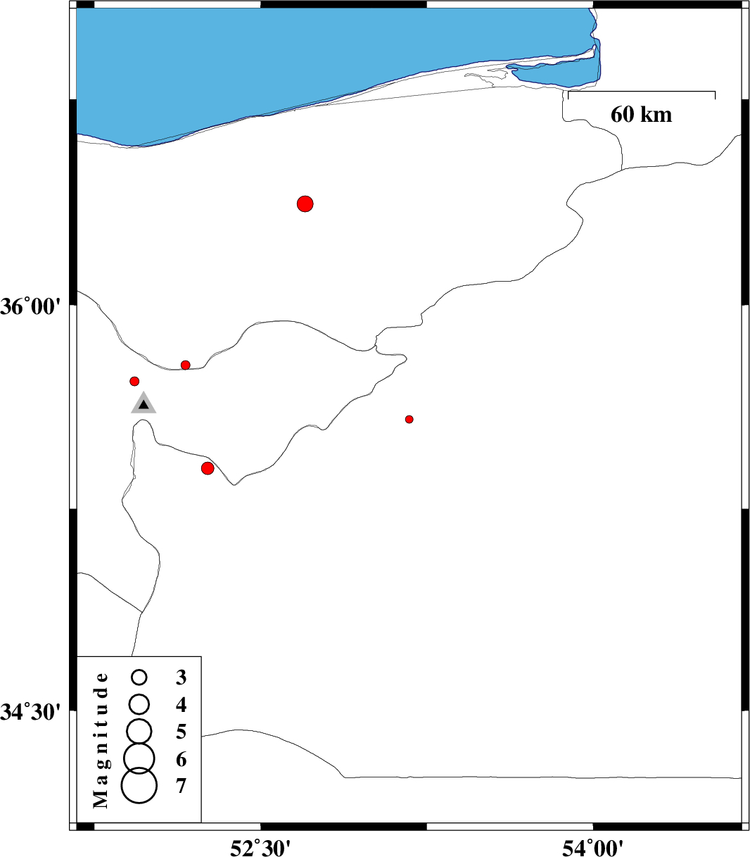 | 2013/12/25 | 09:30:58.7 | 13:00:58.7 | 35.4 | 52.26 | 20 | ML2.5 | Semnan Province, 22 km North of Garmsar |