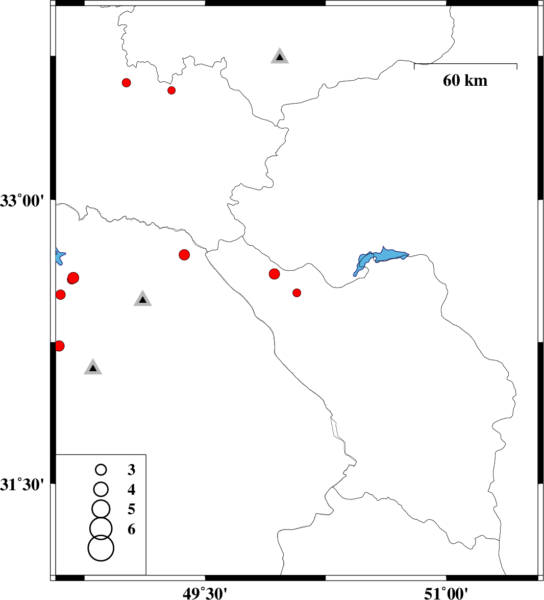 2013/12/07 | 23:42:18.5 | 03:12:18.5 | 32.61 | 49.93 | 14 | ML3 | Chaharmahal Bakhtiari Province, 24 km North-West of Chelgard | ||