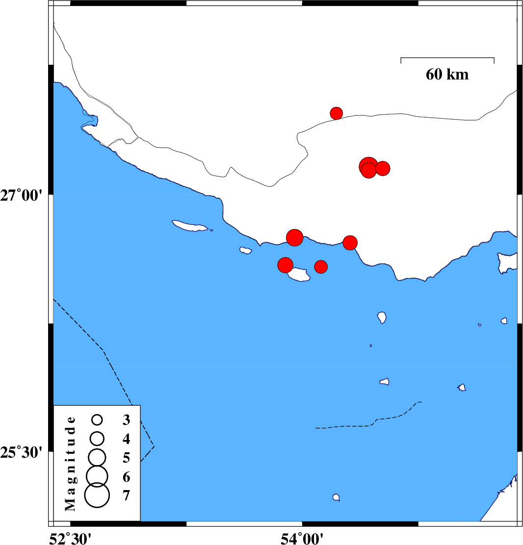| 2014/01/02 | 03:13:56.9 | 06:43:56.9 | 27.16 | 54.43 | 18 | Mb5.6 | Hormozgan Province, 8 km Bastak |