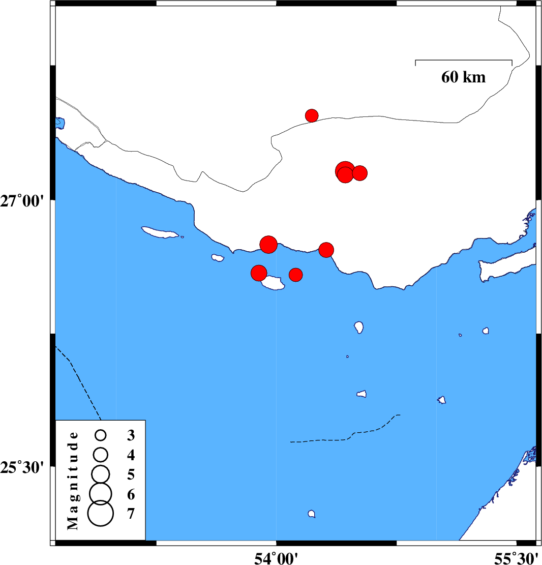 | 2014/01/02 | 03:13:56.9 | 06:43:56.9 | 27.16 | 54.43 | 18 | Mb5.6 | Hormozgan Province, 8 km Bastak |