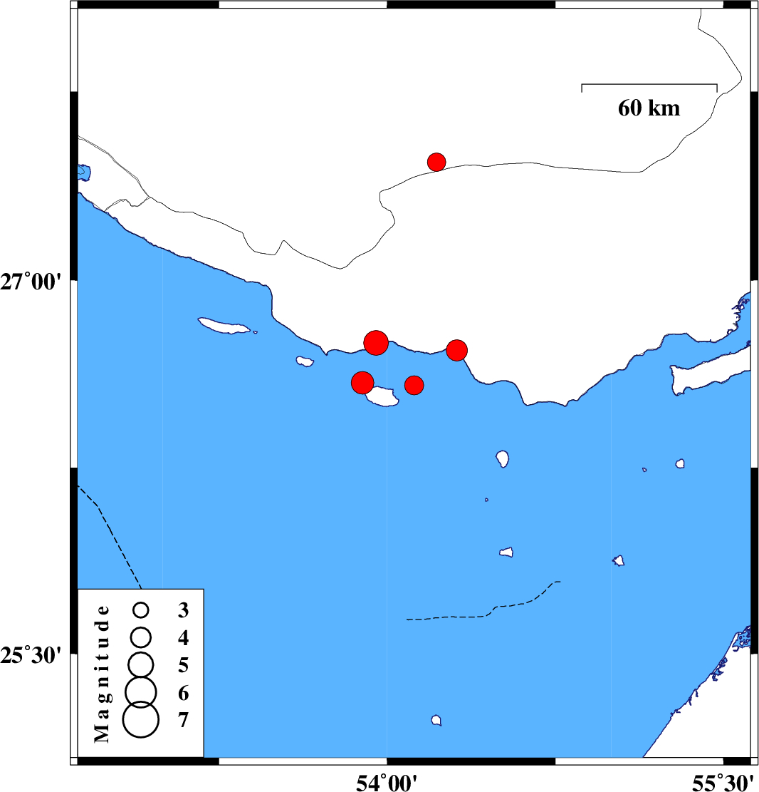 | 2014/01/10 | 14:30:39.3 | 18:00:39.3 | 26.58 | 54.12 | 15 | ML3.8 | Persian Gulf, 73 km West of Bandar-e lengeh | ||