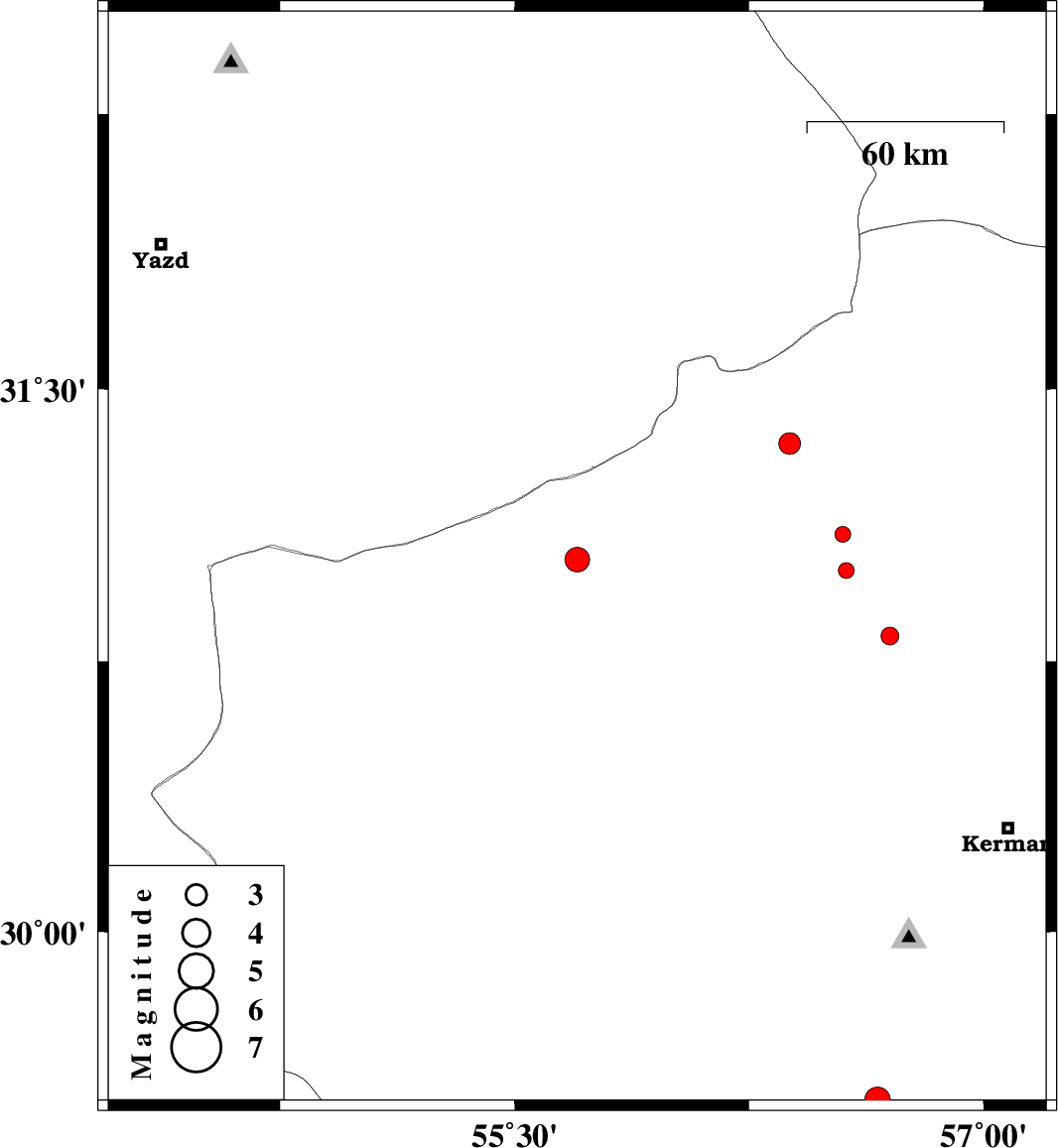 | 2013/12/17 | 08:36:06.7 | 12:06:06.7 | 31.35 | 56.38 | 14 | ML3.1 | Kerman Province, 42 km West of Ravar |