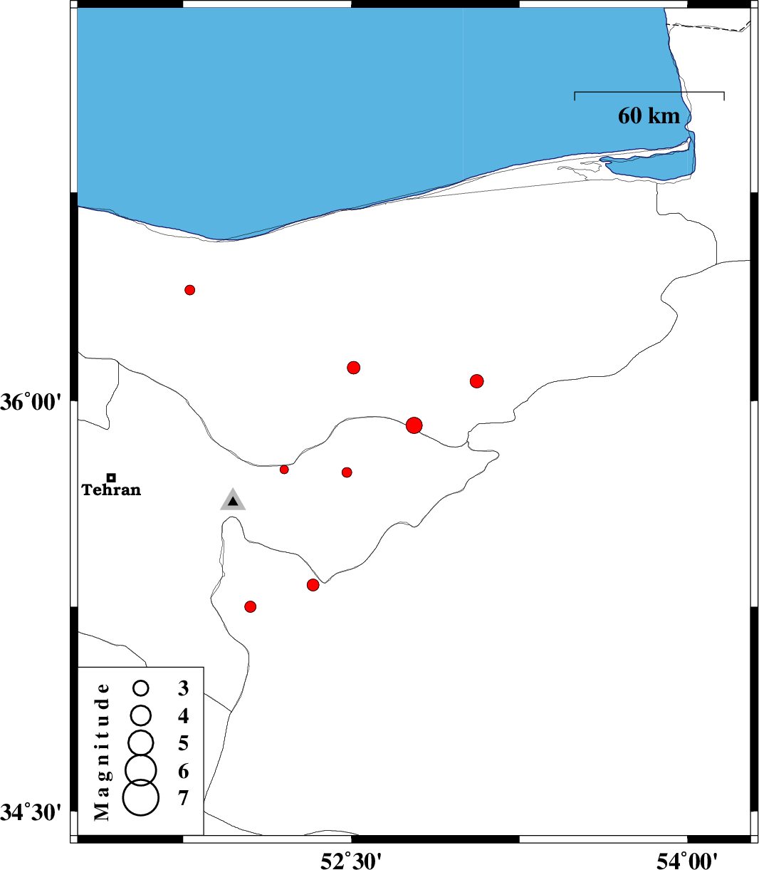 | 2014/01/09 | 16:30:14.6 | 20:00:14.6 | 35.33 | 52.33 | 6 | ML2.4 | Semnan Province, 12 km North of Garmsar | ||