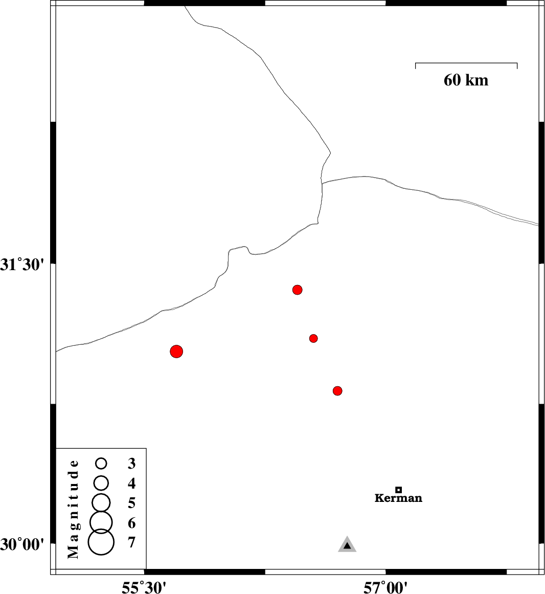| 2014/01/13 | 06:32:02.1 | 10:02:02.1 | 31.03 | 55.7 | 14 | ML3.5 | Kerman Province, 70 km South-East of Bafq | ||