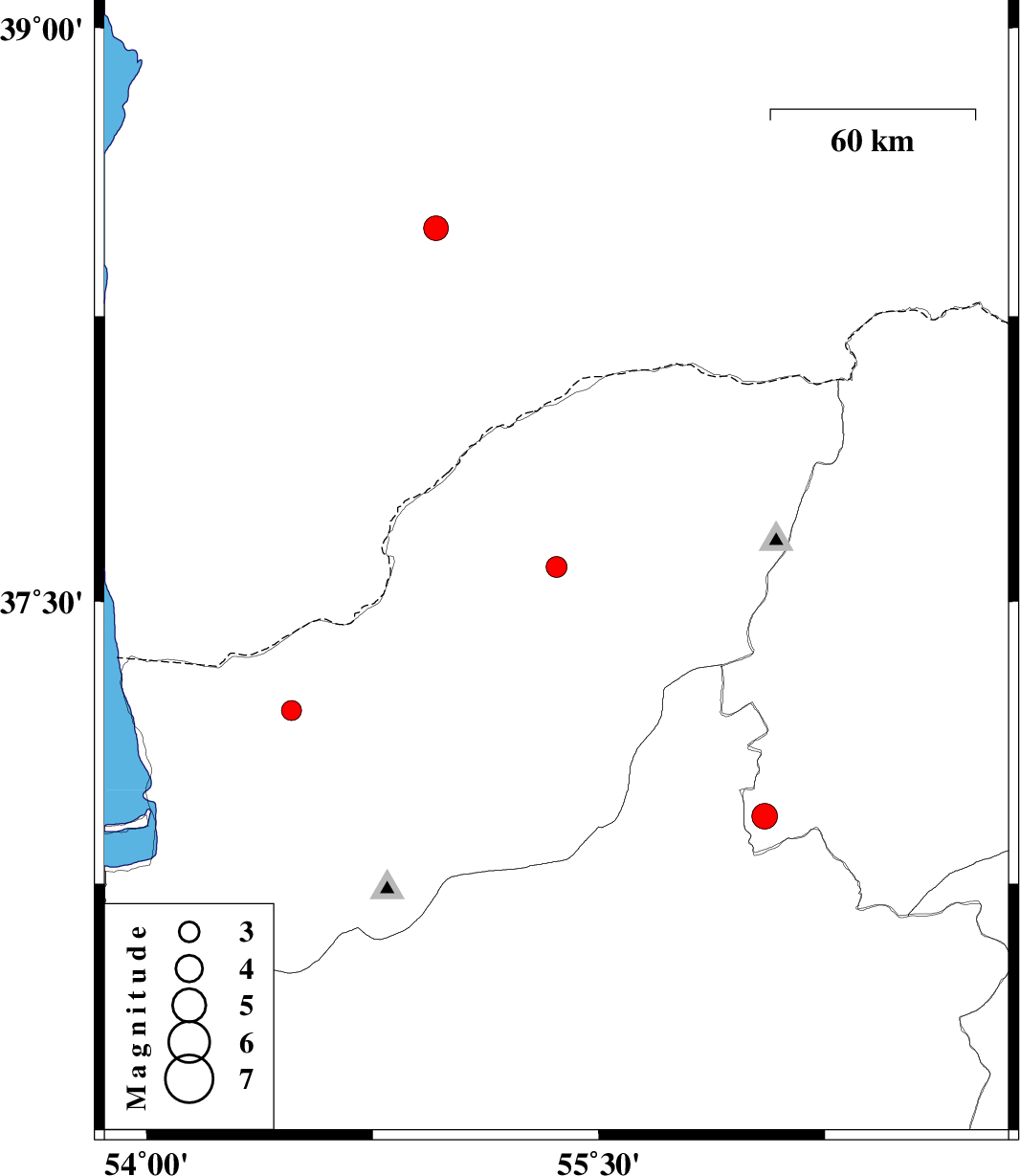 | 2014/01/03 | 17:49:09.1 | 21:19:09.1 | 37.21 | 54.48 | 17 | ML2.9 | Golestan Province, 22 km North of Aq Qaleh | ||