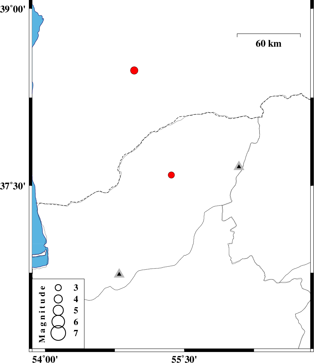 | 2014/01/14 | 22:56:36.2 | 02:26:36.2 | 37.59 | 55.36 | 16 | ML3.1 | Golestan Province, 26 km North-West of Kalaleh | ||