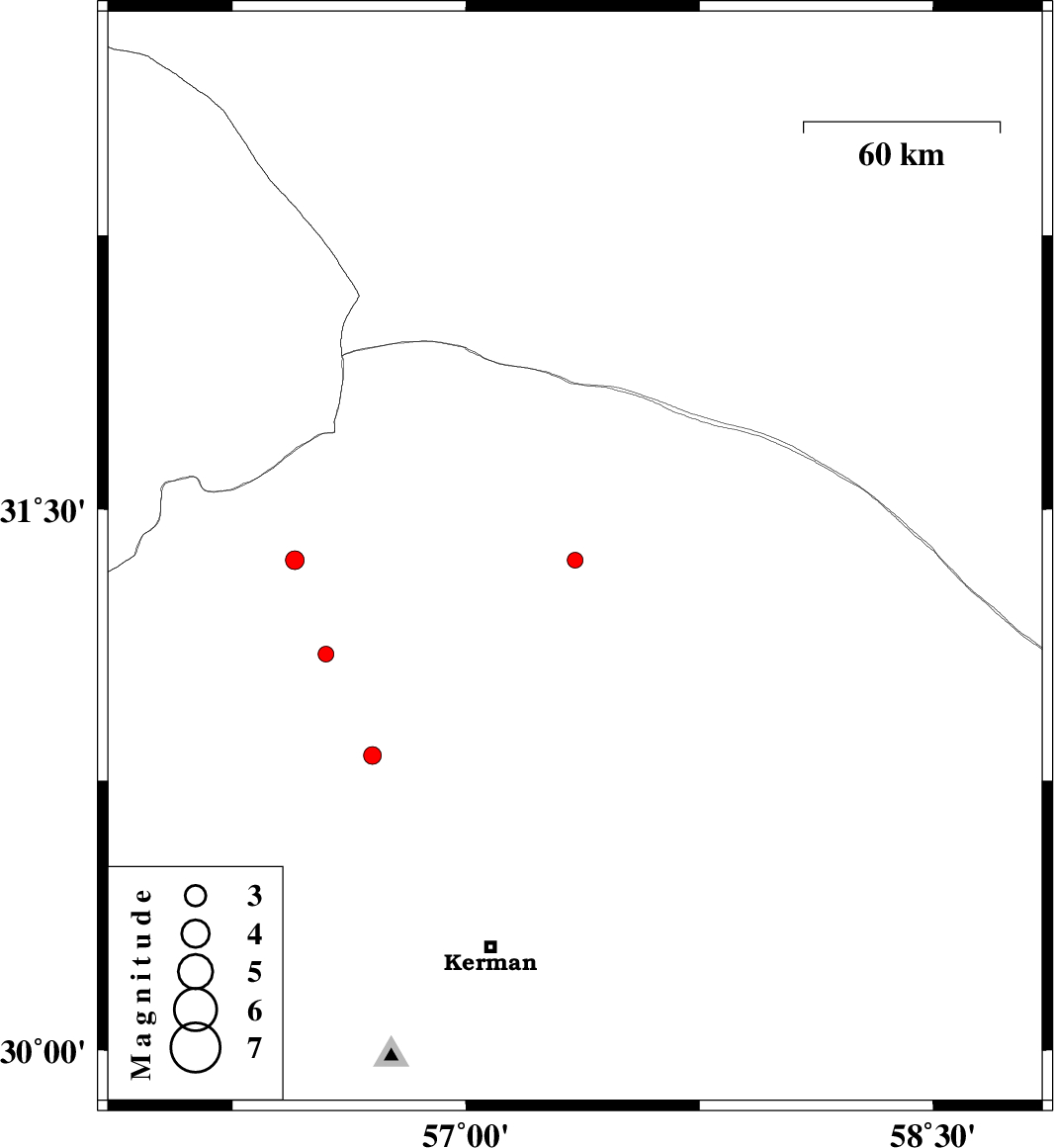 | 2014/01/10 | 10:29:37.7 | 13:59:37.7 | 31.1 | 56.55 | 15 | ML2.3 | Kerman Province, 32 km North of Zarand |