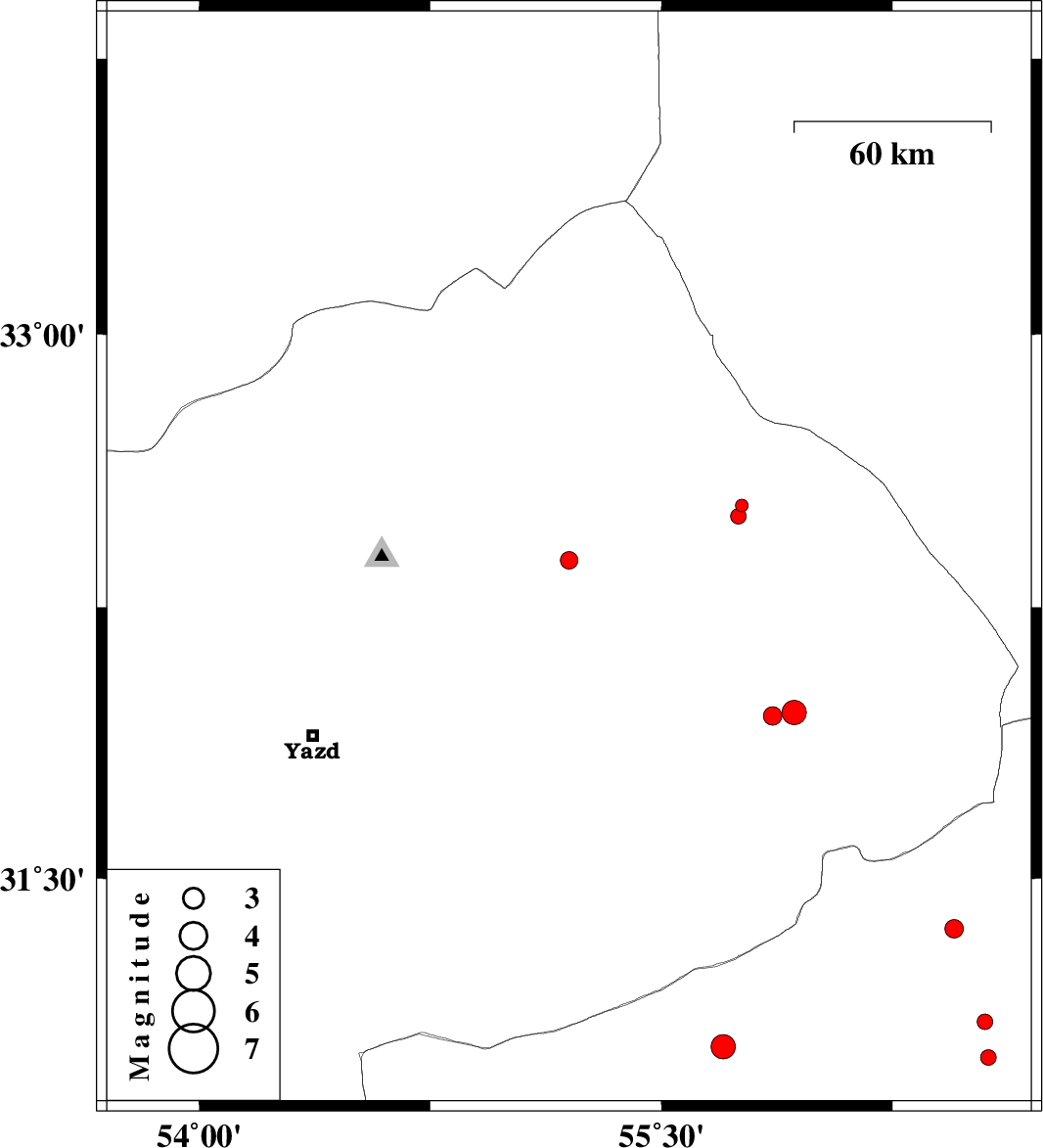 | 2014/01/20 | 01:29:07.7 | 04:59:07.7 | 31.95 | 55.86 | 18 | ML2.7 | Yazd Province, 58 km North-East of Bafq | ||