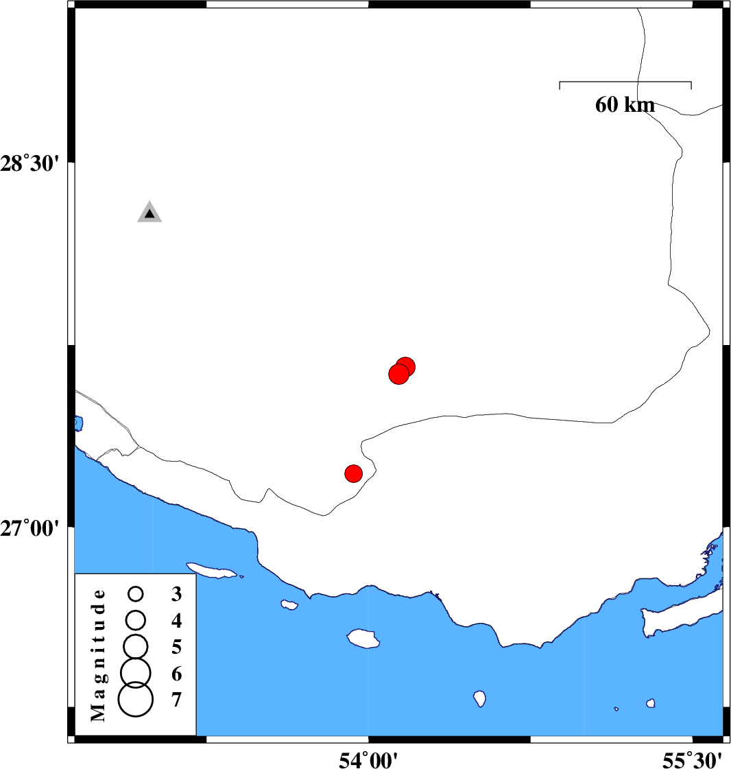 | 2014/01/18 | 12:33:30.6 | 16:03:30.6 | 27.22 | 53.93 | 46 | ML3.7 | Fars Province, 43 km West of Bastak |