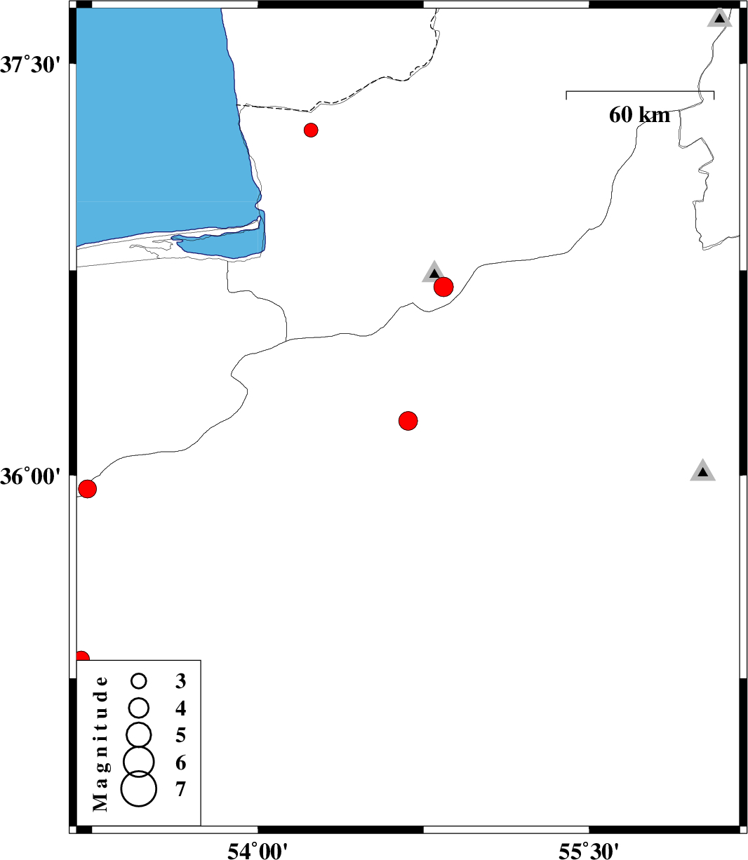 | 2014/01/25 | 09:14:35.2 | 12:44:35.2 | 36.2 | 54.68 | 7 | ML3.8 | Semnan Province, 30 km East of Damghan | ||