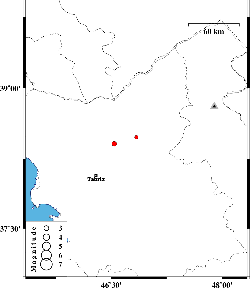 | 2014/01/27 | 10:39:40.2 | 14:09:40.2 | 38.41 | 46.54 | 14 | ML3 | Azarbaijan Sharghi Province, 43 km North-East of Tabriz |