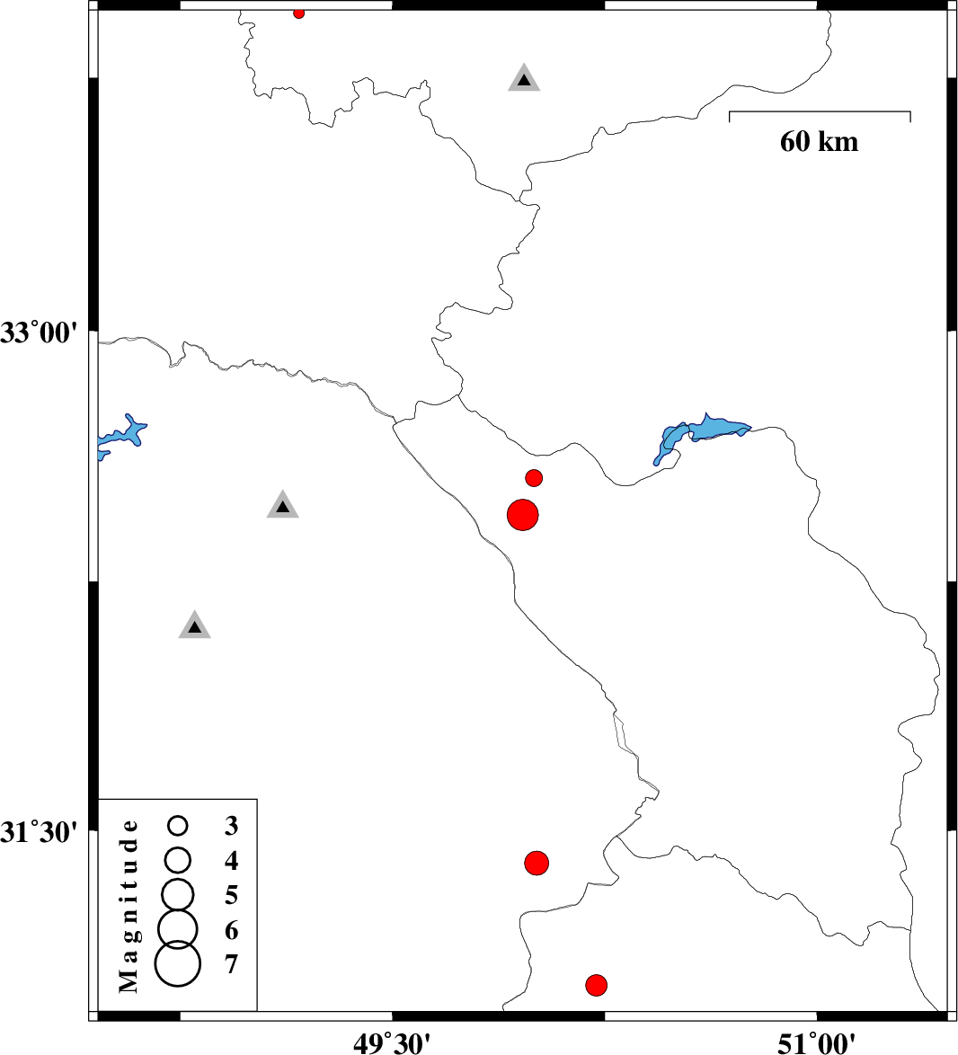| 2014/01/28 | 23:47:36.5 | 03:17:36.5 | 32.45 | 49.96 | 29 | ML4.9 | Chaharmahal Bakhtiari Province, 15 km West of Chelgard | ||