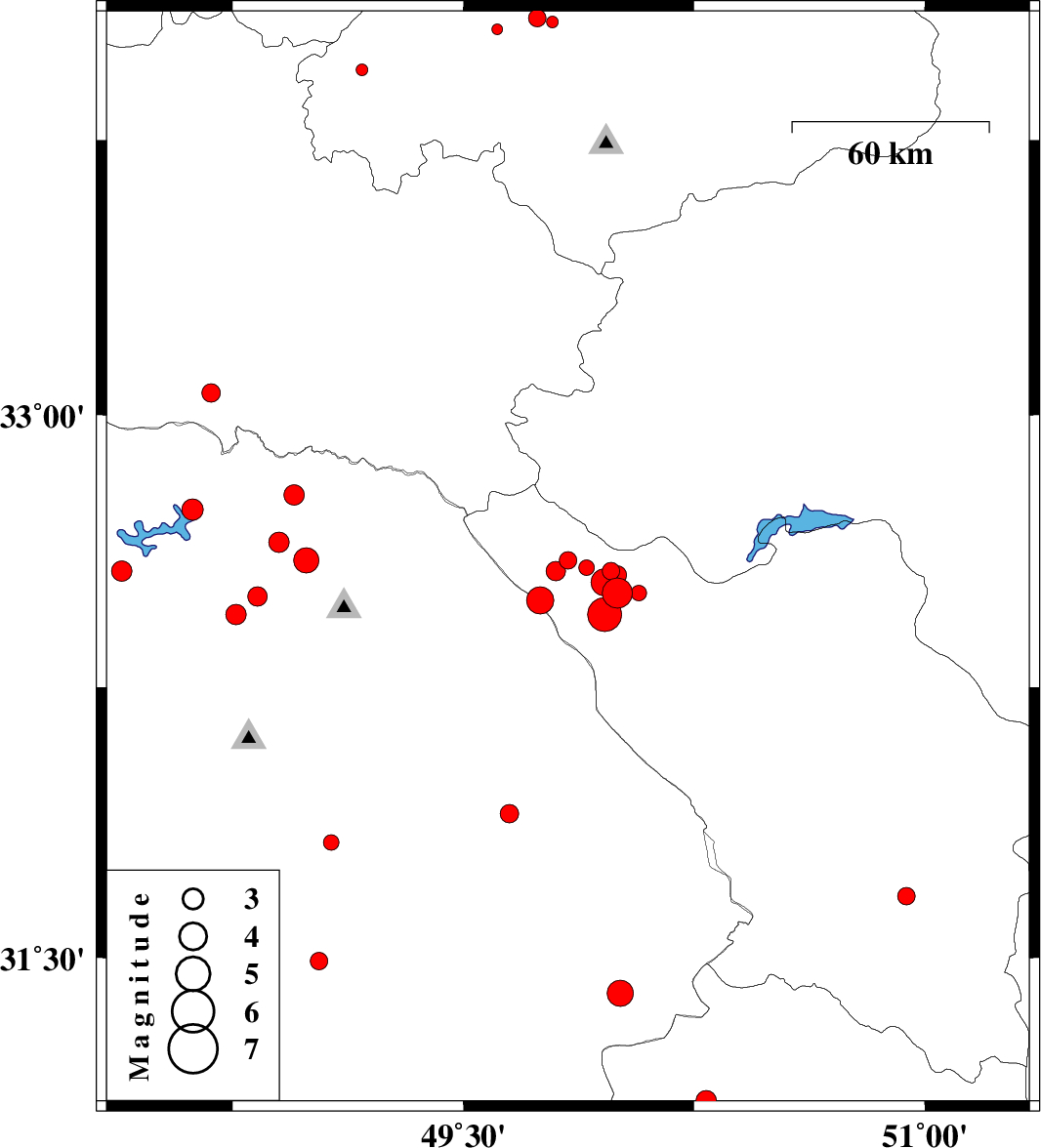 | 2014/01/31 | 13:24:05.3 | 16:54:05.3 | 33.06 | 48.68 | 45 | ML2.7 | Lorestan Province, 55 km South-East of Khorramabad | ||