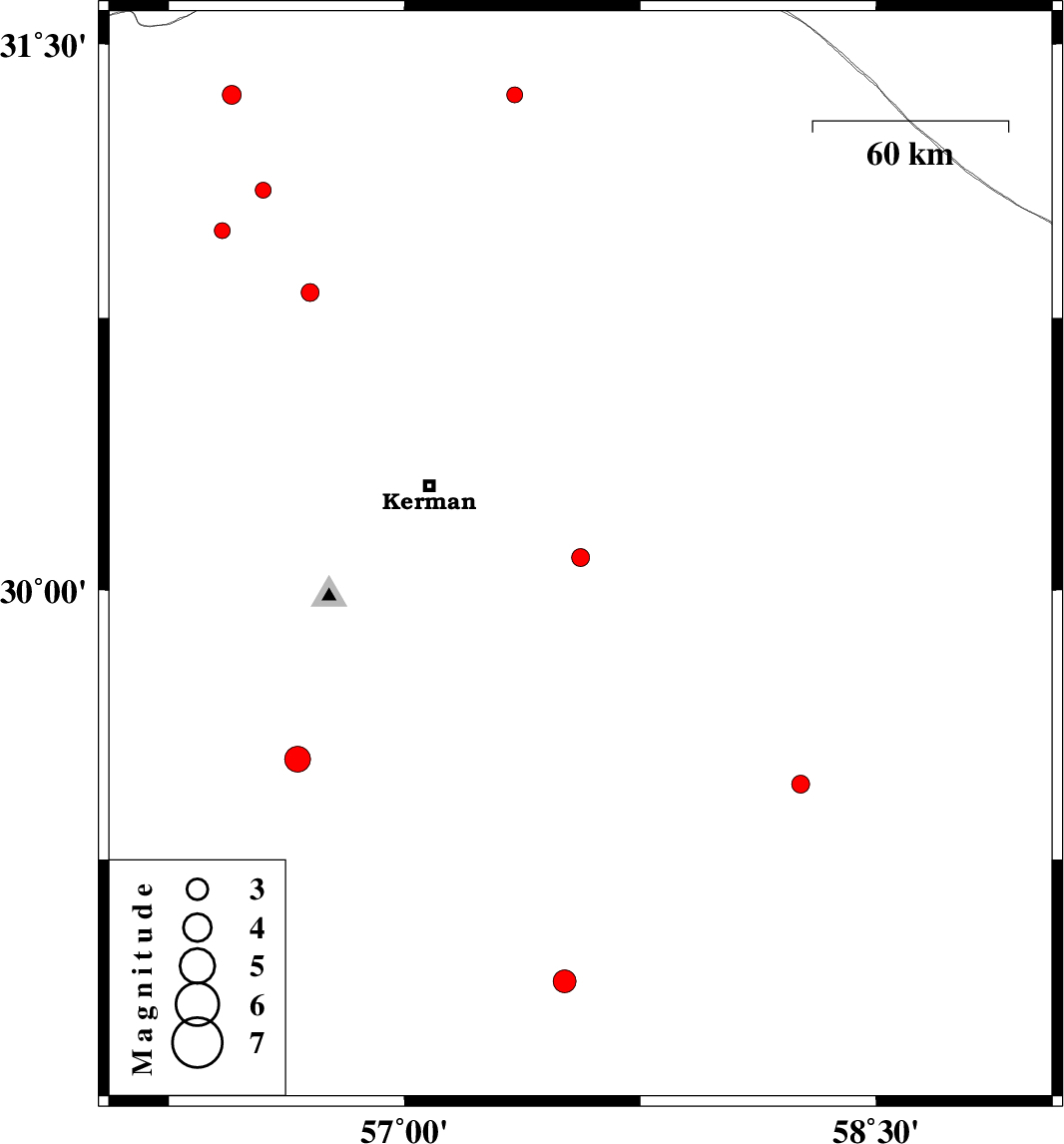 | 2014/01/03 | 19:03:42.1 | 22:33:42.1 | 28.91 | 57.51 | 14 | ML3.2 | Kerman Province, 35 km North-West of Jiroft |