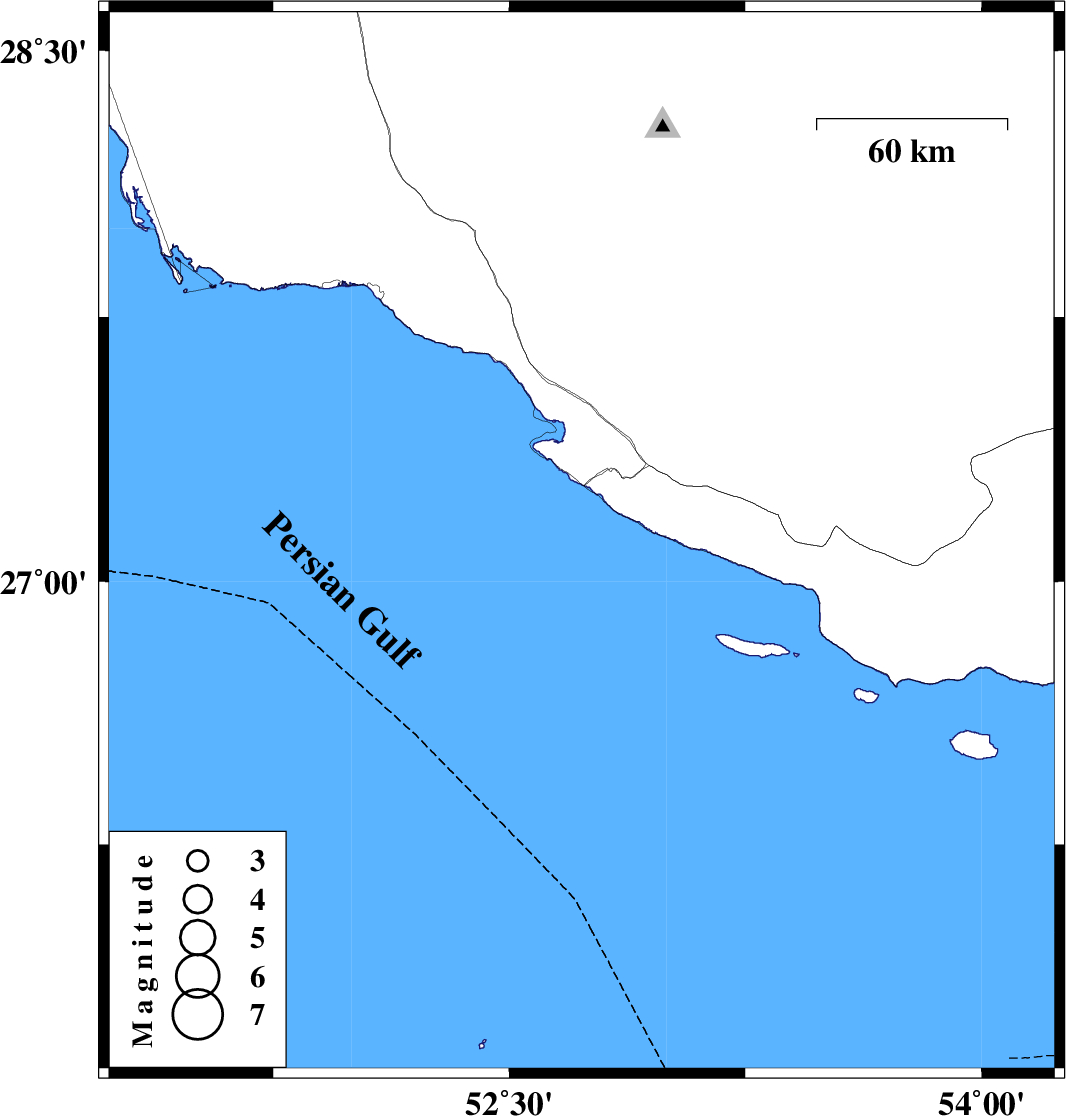 | 2014/02/02 | 10:29:05.1 | 13:59:05.1 | 27.11 | 52.73 | 15 | ML4.8 | Persian Gulf, 51 km South-West of Mehr |