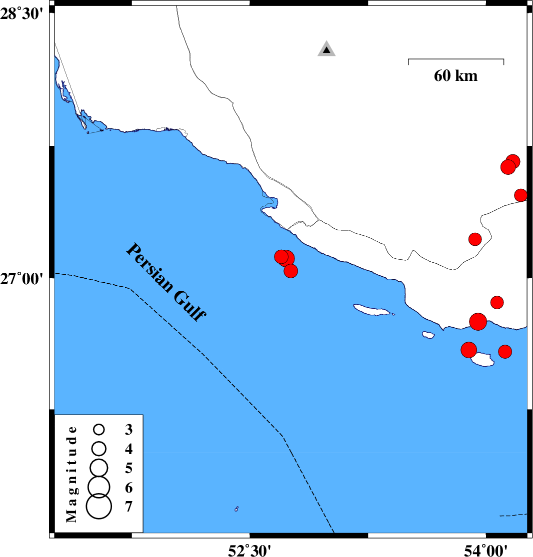 | 2014/02/03 | 19:33:43.9 | 23:03:43.9 | 27.04 | 52.76 | 15 | ML3.9 | Persian Gulf, 58 km South-West of Mehr | ||