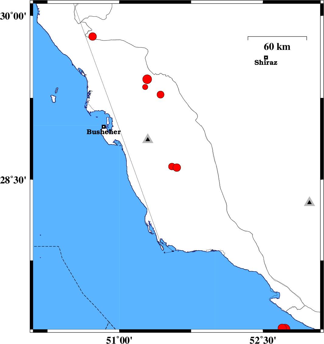 | 2014/01/15 | 23:57:15.9 | 03:27:15.9 | 29.42 | 51.29 | 5 | ML4.3 | Bushehr Province, 20 km North of Borazjan | ||