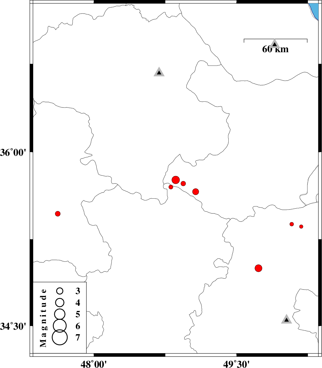 2014/02/04 | 01:42:08.5 | 05:12:08.5 | 35.76 | 48.86 | 39 | ML3.6 | Ghazvin Province, 45 km North-West of Razan | ||