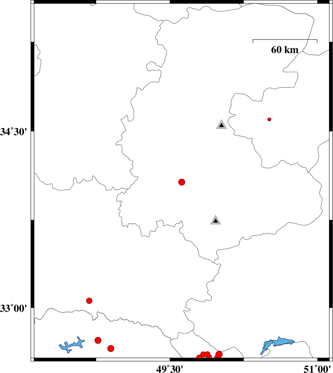 | 2014/01/31 | 13:24:05.3 | 16:54:05.3 | 33.06 | 48.68 | 45 | ML2.7 | Lorestan Province, 55 km South-East of Khorramabad | ||