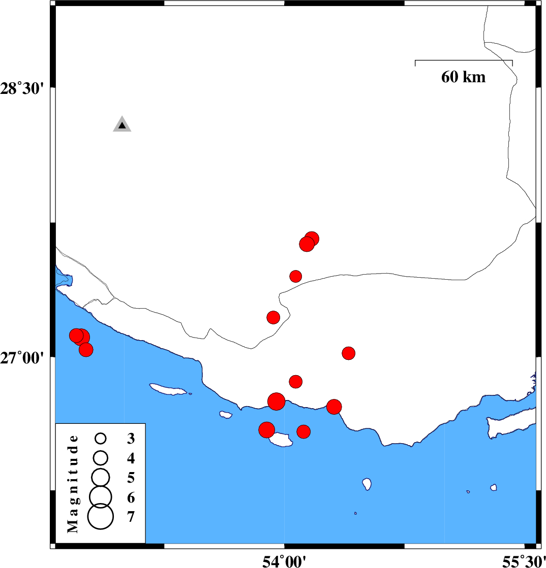 | 2014/01/10 | 14:30:39.3 | 18:00:39.3 | 26.58 | 54.12 | 15 | ML3.8 | Persian Gulf, 73 km West of Bandar-e lengeh | ||