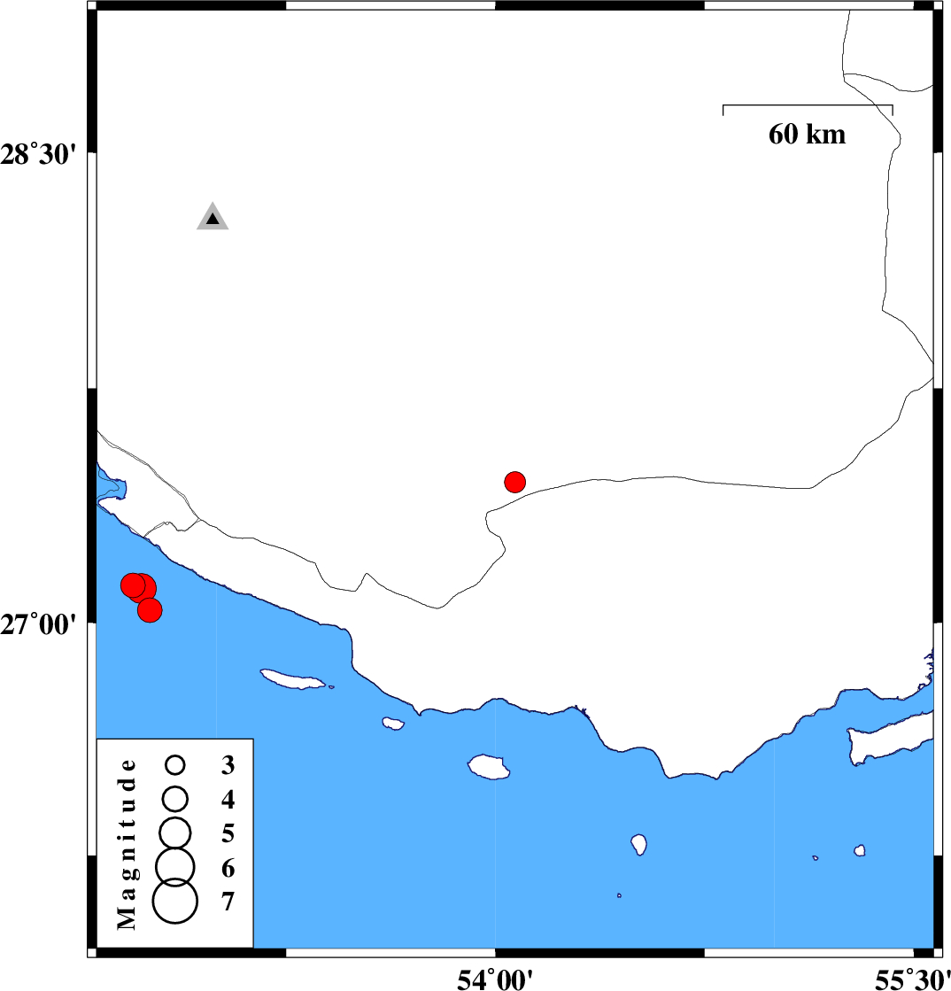 | 2014/02/02 | 10:29:05.1 | 13:59:05.1 | 27.11 | 52.73 | 15 | ML4.8 | Persian Gulf, 51 km South-West of Mehr |