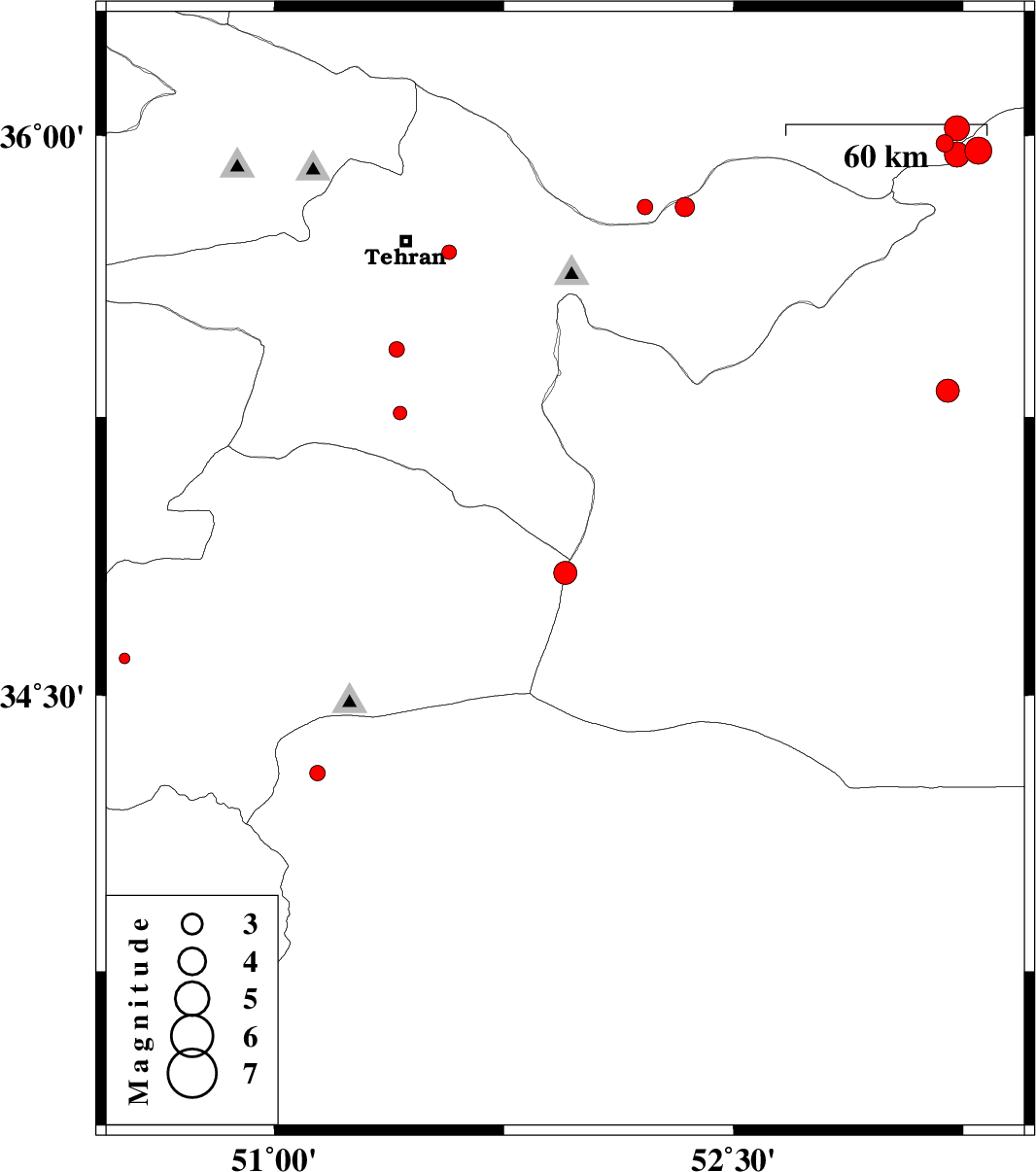 | 2014/01/16 | 07:27:46.8 | 10:57:46.8 | 35.69 | 51.57 | 34 | ML2.1 | Tehran Province, 15 km East of Tehran |