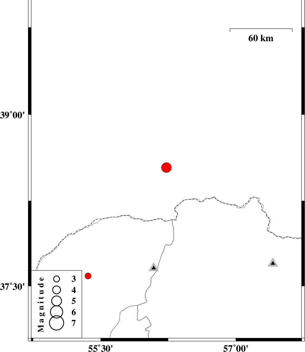 | 2014/01/14 | 22:56:36.2 | 02:26:36.2 | 37.59 | 55.36 | 16 | ML3.1 | Golestan Province, 26 km North-West of Kalaleh |