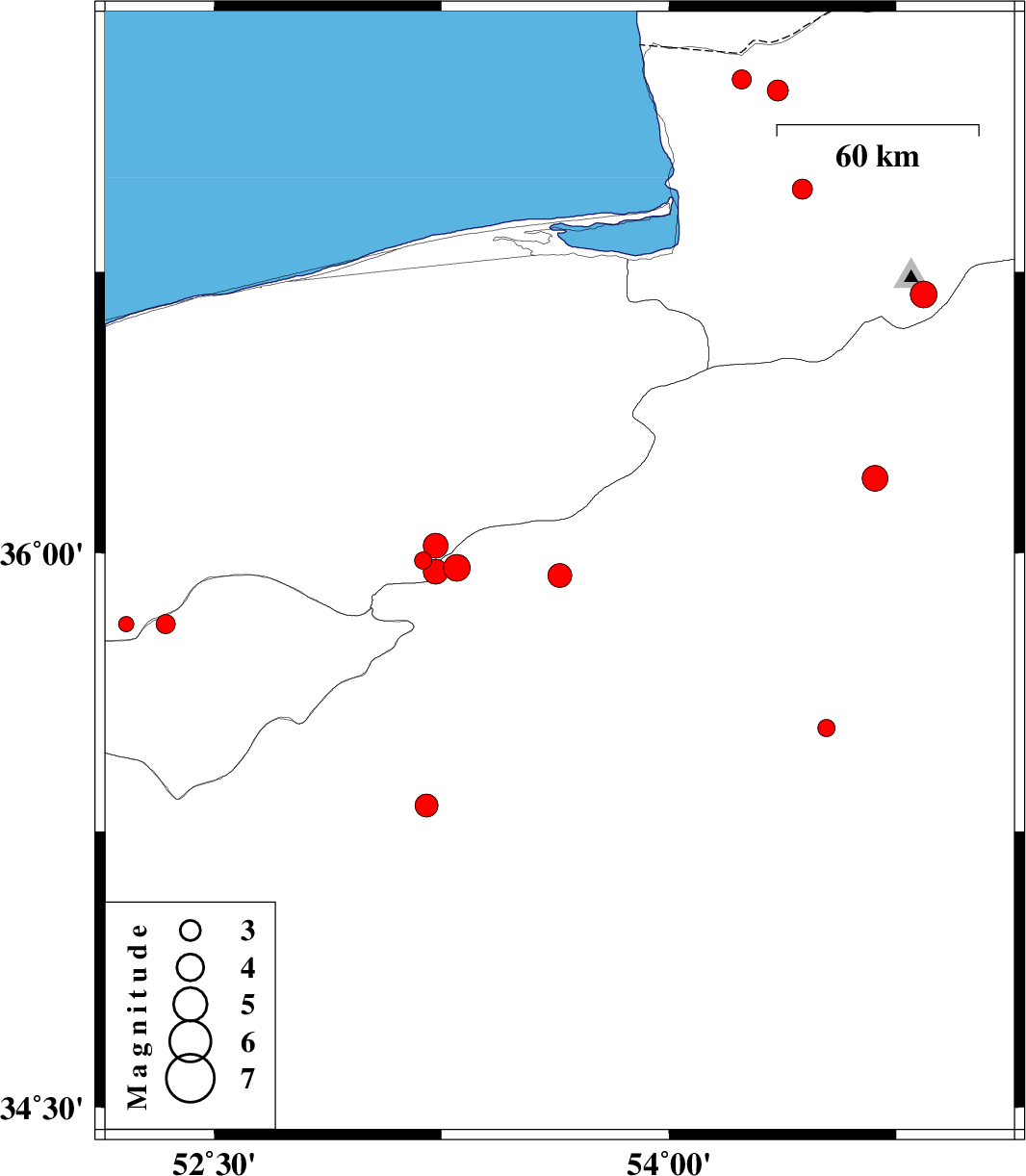 | 2014/01/25 | 09:14:35.2 | 12:44:35.2 | 36.2 | 54.68 | 7 | ML3.8 | Semnan Province, 30 km East of Damghan | ||