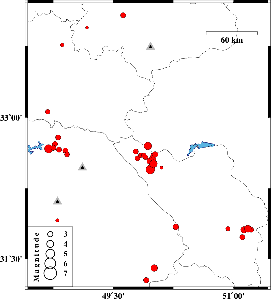 | 2014/01/31 | 13:24:05.3 | 16:54:05.3 | 33.06 | 48.68 | 45 | ML2.7 | Lorestan Province, 55 km South-East of Khorramabad | ||